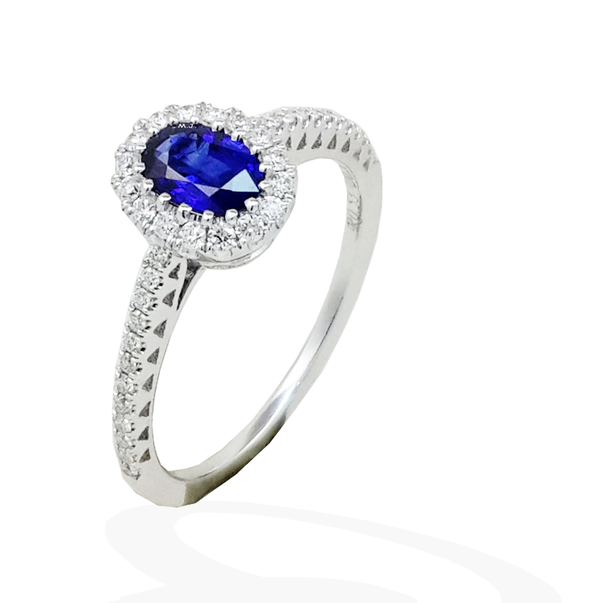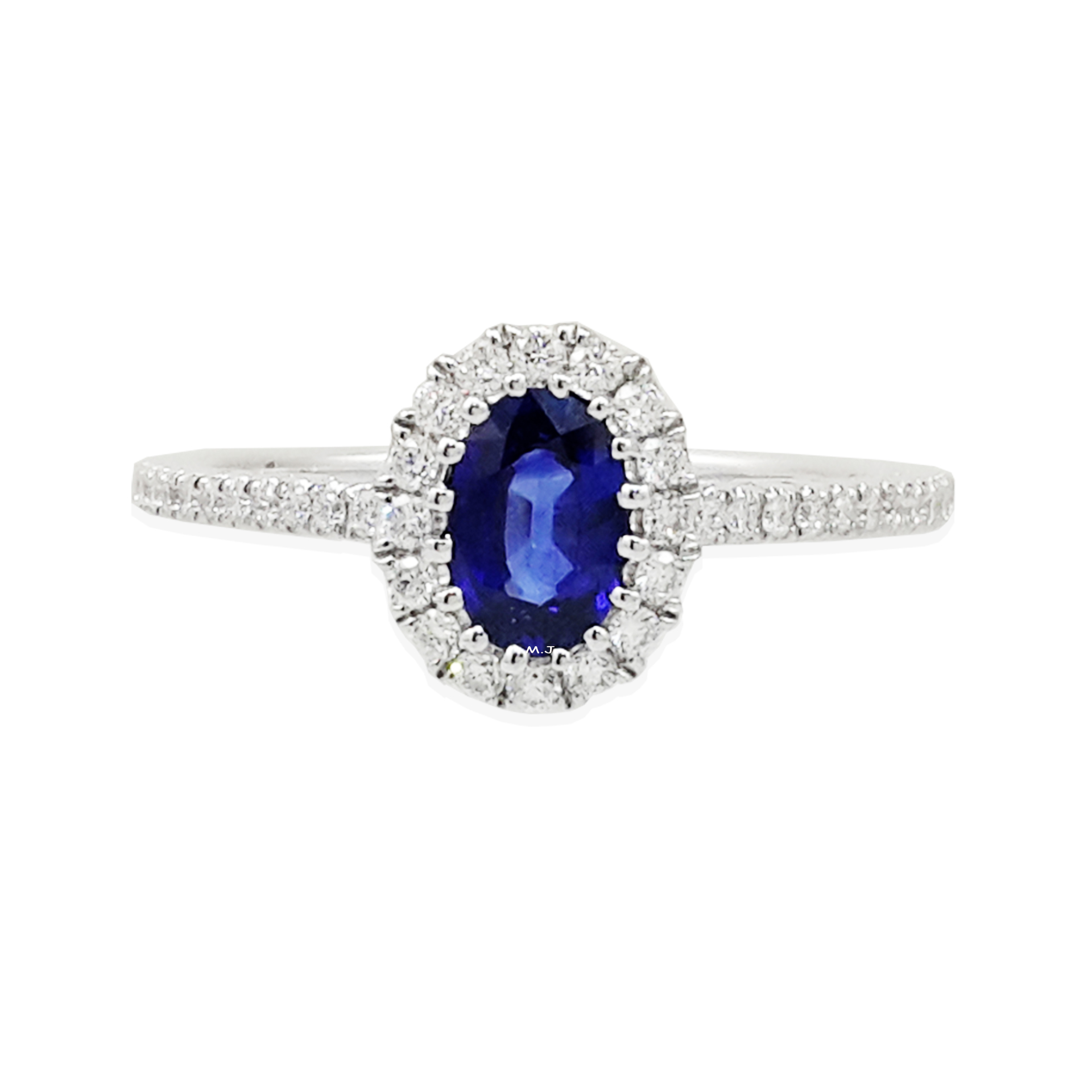 Main blue sapphire from Sri Lanka weights 0.53 carat. Diamonds total weight 0.26 carat.